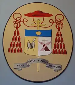 La devise Vos Sois Todos Irmaos (« Vous êtes tous frères ») du cardinal sur le fronton de l'église Sant'Antonio da Padova all'Esquilino.