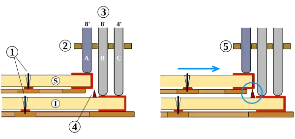 Les deux jeux de 8' eux-mêmes ne rendent pas exactement le même son, le spectre harmonique dépend en effet de la position du « point de pincement » ou distance séparant le bec du sautereau et le sillet[12]. Le schéma ci-dessus montre que si deux registres se partagent le même sillet, les points de pincements sont séparés de quelques dizaines de mm.