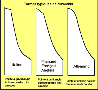 - ↑ Ceci distingue le grand clavecin des autres instruments de la famille ou les cordes sont inclinées différemment par rapport au clavier