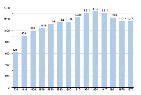 Les chiffres des années 1831 à 1970 tiennent compte des chiffres des anciennes communes fusionnées.