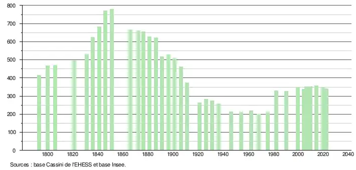 L'évolution du nombre d'habitants est connue à travers les recensements de la population effectués dans la commune depuis 1793. Pour les communes de moins de 10 000 habitants, une enquête de recensement portant sur toute la population est réalisée tous les cinq ans, les populations de référence des années intermédiaires étant quant à elles estimées par interpolation ou extrapolation[17]. Pour la commune, le premier recensement exhaustif entrant dans le cadre du nouveau dispositif a été réalisé en 2004[18].