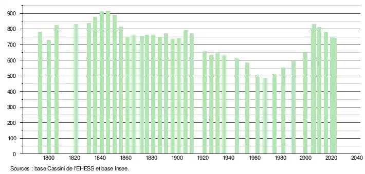 | L'évolution du nombre d'habitants est connue à travers les recensements de la population effectués dans la commune depuis 1793. Pour les communes de moins de 10 000 habitants, une enquête de recensement portant sur toute la population est réalisée tous les cinq ans, les populations de référence des années intermédiaires étant quant à elles estimées par interpolation ou extrapolation[20]. Pour la commune, le premier recensement exhaustif entrant dans le cadre du nouveau dispositif a été réalisé en 2005[21]. En 2022, la commune comptait 742 habitants[Note 2], en évolution de −4,13 % par rapport à 2016 (Landes : +5,78 %, France hors Mayotte : +2,11 %). |