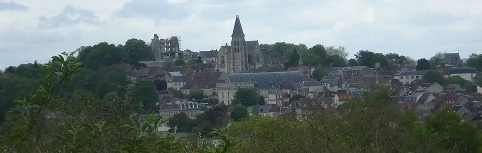 De haut en bas et de gauche à droite: panorama de la ville; la place de l'hôtel-de-ville; vue de l'ancien donjon; l'église Saint-Samson; la porte Nointel; l'hôtel de ville; la gare; la promenade du Châtellier. |