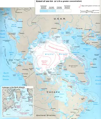 La carte de droite montre les zones couvertes par la glace de mer lorsqu'elle est à son maximum (mars) et à son minimum (septembre). Cette carte a été réalisée dans les années 1970 et l'étendue de la glace de mer a diminué depuis lors, mais elle donne une vue d'ensemble raisonnable. À son maximum, en mars, la glace de mer couvre environ 15 millions de km2 de l'hémisphère nord, soit presque autant que le plus grand pays du monde, la Russie[14].