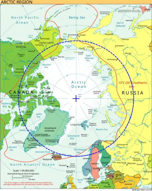 Il existe plusieurs définitions de la région arctique[4],[5]. La limite généralement admise est donnée par le cercle arctique (latitude 66° 34′ N), où, lors des solstices, il fait jour ou nuit pendant vingt-quatre heures,. Selon cette définition, l'Arctique représente une surface d'environ 21 027 000 km2[réf. nécessaire]. D'autres définitions s'appuient sur des données climatiques et environnementales, comme la courbe isotherme des 10 °C au mois de juillet, une limite, variable dans le temps, qui marque approximativement la limite au-delà de laquelle les arbres ne poussent plus[5],[6]. Politiquement et socialement, la région arctique inclut les territoires nordiques des huit États arctiques, dont la Laponie et l'Inuit Nunangat qui sont en grande partie situés au nord du cercle arctique, bien qu'en sciences naturelles cette partie soit considérée comme subarctique[6].