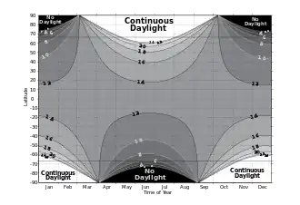 En outre, la durée de chaque journée, déterminée par la saison, a un impact significatif sur le climat. Les journées de 24 heures que l'on trouve près des pôles en été se traduisent par un flux solaire moyen journalier important atteignant le sommet de l'atmosphère dans ces régions. Au solstice de juin, le rayonnement solaire qui atteint le sommet de l'atmosphère au cours de la journée est 36 % plus élevé au pôle Nord qu'à l'équateur[7]. Cependant, au cours des six mois qui vont de l'équinoxe de septembre à l'équinoxe de mars, le pôle Nord ne reçoit pas de lumière solaire.