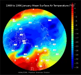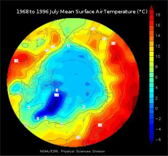 Les cartes de droite montrent la température moyenne dans l'Arctique en janvier et en juillet, qui sont généralement les mois les plus froids et les plus chauds. Ces cartes ont été réalisées à partir des données de la réanalyse NCEP/NCAR (en), qui incorpore les données disponibles dans un modèle informatique afin de créer un ensemble cohérent de données mondiales. Ni les modèles ni les données ne sont parfaits, de sorte que ces cartes peuvent différer d'autres estimations des températures de surface ; en particulier, la plupart des variables climatiques de l'Arctique indiquent que les températures au-dessus du centre de l'océan Arctique en juillet se situent en moyenne juste au-dessous du point de congélation, soit quelques degrés de moins que ce qu'indiquent ces cartes[7],[8](URSS, 1985). Une variable climatique antérieure des températures dans l'Arctique, basée entièrement sur les données disponibles, est présentée dans cette carte de l'Atlas des régions polaires de la CIA[8].