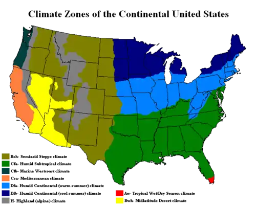 La majeure partie du pays se trouve dans la zone tempérée, ou plutôt dite « tempérée » car la position des États-Unis, à un carrefour d'influence climatiques opposées en fait le territoire des phénomènes climatiques extrêmes (voir ci-dessous). Seuls l'État d'Hawaï, le sud de la Floride et l'Alaska sont situés en dehors de cette zone.