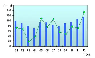 Sur le diagramme ci-contre, les barres verticales représentent la moyenne des précipitations à Belfort relevées par Météo-France de 1971 à 2000. On constate deux minima : au printemps et en été. L'hiver correspond à un maximum de précipitations : pluie ou neige. Mais ces valeurs statistiques gomment les variations qui se produisent d'une année sur l'autre. La courbe en vert correspond à la hauteur d'eau reçue à Bourg-sous-Châtelet pour chaque mois de l'année 2005. Les pluies d'été sont le plus souvent apportées par des averses orageuses qui déversent en une seule journée une quantité d'eau parfois importante : 60mm d'eau à Joncherey le .