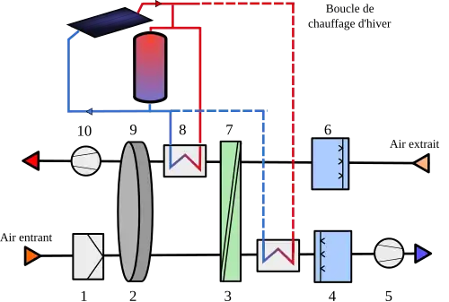 - 7 et 8 - On chauffe l'air extrait afin de lui permettre d'absorber encore plus d'humidité ; d'abord par récupération de la chaleur de l'air entrant (dans l'échangeur 3/7, couplé à l'étape 3 pour l'air entrant), puis par chauffage dans le radiateur 8