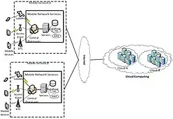 - Mobile Cloud Networking[17] : Mobile Cloud Networking (MCN) était un projet intégrateur à grande échelle du 7e PC de l'UE (IP, 15 millions d'euros) financé par la Commission européenne. Le projet MCN a été lancé en pour une période de 36 mois. Le projet était coordonné par SAP Research et l'ICCLab[18] de l'Université des sciences appliquées de Zurich[19]. 19 partenaires de premier plan issus de l'industrie et du monde universitaire ont établi la toute première vision du Mobile Cloud Computing. Le projet était principalement motivé par une transformation en cours qui entraîne la convergence entre les secteurs des communications mobiles et de l'informatique en cloud, rendue possible par l'Internet, et est considéré comme le tout premier pionnier dans le domaine de la virtualisation des fonctions réseau (en).