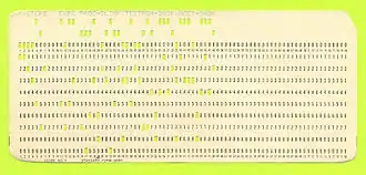 - Chaque perforation de chiffre 0 à 9 des cartes perforées précédentes devenait codée en décimal codé binaire (DCB/BCD), il s'agit des lignes de bits 1, 2, 4 et 8 sur la carte, offrant 10 valeurs.