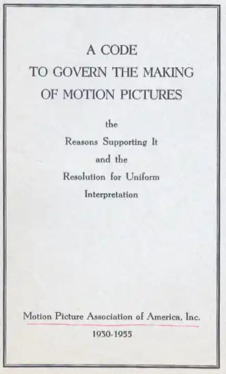 Dans un premier temps, ces recommandations ne sont guère suivies, jusqu'à ce que se renforce le contrôle financier sur les productions et que par ailleurs, à l'appel du pape Pie XI, les évêques américains fondent une Légion de la Décence qui va mener une virulente campagne en faveur de l'application stricte du Code[7]. Celle-ci sera effective à compter du [8], et désormais, plus que jamais, estime l'historien du cinéma Georges Sadoul, l'industrie hollywoodienne va se tourner vers le répertoire théâtral ou romanesque. L'application du Code, si elle ne vise guère par exemple le film d'horreur, a des conséquences entre autres sur le film de gangsters, qui se fait parfois moralisateur avant de s'effacer, et surtout sur les scènes d'amour[7], alors que les films de l'ère Pré-Code avaient pu aller assez loin dans la nudité ou ruser déjà pour éviter la censure.
