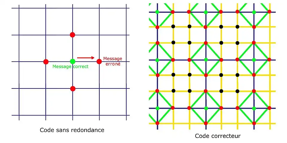 Si un code correcteur est utilisé, la figure de droite illustre le mécanisme. L'émetteur plonge son message dans un espace plus vaste, le mot de code correspond à un point vert. L'espace dispose maintenant du quadrillage supplémentaire orange. Si la transmission engendre une unique erreur, alors le message reçu devient un point rouge, si l'altération n'est pas plus grande que le déplacement sur un segment du quadrillage. Le récepteur reçoit alors un message rouge, qui n'est pas un mot de code (car le code correspond aux points verts). Sachant qu'un mot de code a été envoyé et sachant que la transmission ne produit qu'une erreur (c’est-à-dire un unique déplacement sur le quadrillage) il existe un moyen de corriger la transmission.