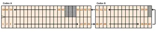 La numérotation des pages a été effectuée par Agostino Aglio, qui fut le premier à transcrire le manuscrit entre 1825 et 1826. Pour ce faire, il a divisé le codex en deux parties, intitulées Codex A et Codex B. Et il a établi la séquence de lecture suivante : Lecture complète du recto du Codex A, suivie de la lecture du verso en sens inverse, c’est-à-dire à partir de la dernière feuille du recto, puis lecture du Codex B dans le même ordre.