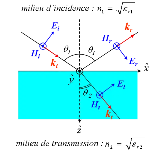 - Transverse magnétique (TM) : le champ magnétique incident est polarisé perpendiculairement au plan d'incidence, le champ électrique est contenu dans le plan d'incidence.