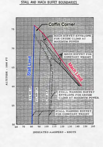 Lorsque l'altitude d'un avion augmente, sa vitesse de décrochage augmente également, mais sa vitesse maximale diminue, entraînant ainsi une diminution du domaine de vol, le « coin du cercueil » fait ainsi référence à la forme triangulaire (en haut d'un tableau illustrant le domaine de vol) se formant par la convergence, avec l'altitude, des courbes de décrochage et de vitesse maximale, jusqu'à se situer à quelques nœuds l'un de l'autre.