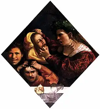 Deux autres figures masculines se trouvent à gauche : un garçon qui s'arrache les cheveux, geste typique des personnifications de la Colère, et un autre qui rit dans le dos des femmes, symbole de la Méchanceté. Au premier plan, sur une pierre pâle, un verre renversé et un pain brisé, peut-être une référence au tumulte provoqué par la colère.