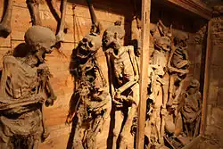 Elle est en outre connue pour abriter des « momies ». Si la plupart de ses caveaux ont été violés et pillés à la Révolution française, on retrouva lors de réparations en 1837 dans celui de la dernière chapelle, une quarantaine de squelettes conservés grâce à l'alun et à l'arsenic du sol. On ne sait pas qui sont ces corps ni pourquoi ils se trouvent là, ni même depuis quand ils y sont. Les premières hypothèses laissaient supposer qu'il pourrait s'agir de victimes du baron des Adrets qui sévit dans la région en 1562. Cependant des recherches au carbone 14 ont montré que les momies dataient en réalité du XVe, XVIe et XVIIe siècles. Il pourrait s'agir en fait du caveau d'une famille de notables locale.