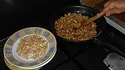 Une fois les "pistaches" décortiquées et leurs petites pellicules rouges enlevées, parfois traditionnellement dans des vans en osier, les cacahuètes sont enrobées d'un caramel épais atteignant une densité requise de degré Baumé, préparé à base d'une proportion de sucre et éventuellement d'eau. Le tout est ensuite étalé avec soin sur des plaques huilées et mis à refroidir pour durcir, pour être finalement présenté, soit sous forme de brisures, soit découpé sous forme de larges nougats, que l'on peut trouver facilement à acheter localement en boutiques, en boulangeries ou sur les marchés.