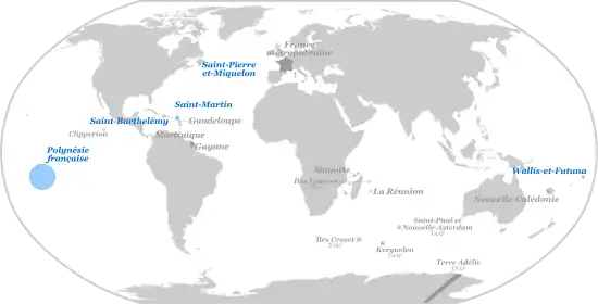 987 | Papeete | 4 200 km2 | 275 918 (2017)[16] | UTC−10:00, -9:30, -9:00 | 1880 : colonie 1946 : territoire d'outre-mer 2003 : collectivité d'outre-mer |