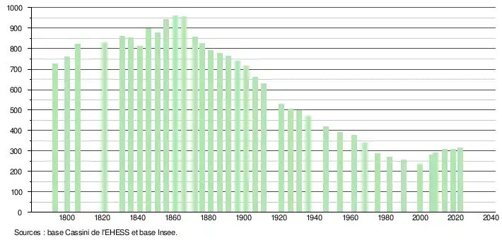 L'évolution du nombre d'habitants est connue à travers les recensements de la population effectués dans la commune depuis 1793. Pour les communes de moins de 10 000 habitants, une enquête de recensement portant sur toute la population est réalisée tous les cinq ans, les populations de référence des années intermédiaires étant quant à elles estimées par interpolation ou extrapolation[16]. Pour la commune, le premier recensement exhaustif entrant dans le cadre du nouveau dispositif a été réalisé en 2008[17].