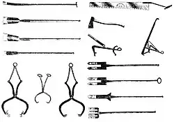 La récolte demandait de nombreux équipements. Des éléments de protection comme des chaussures en liège et des fers à cheval cloutés permettaient aux travailleurs d'opérer sans risques sur la glace[146]. Au début du XIXe siècle, la récolte se faisait avec des outils improvisés comme des pioches et des ciseaux mais dans les années 1840, Wyeth introduisit de nouveaux outils permettant d'industrialiser et de rentabiliser cette récolte[156]. Il développa ainsi un outil ressemblant à une charrue à deux lames tiré par un cheval qui facilitait et uniformisait le marquage des blocs puis une charrue équipée d'une scie pour remplacer la scie à main dans la découpe de la glace[157]. À partir des années 1850, des artisans spécialisés dans ce domaine éditaient des catalogues et vendaient des outils sur toute la côte Est[158]. Des essais furent menés tout au long du XIXe siècle pour mettre au point une scie circulaire mais elle se révéla impossible à motoriser avec des chevaux et elle ne fut utilisée qu'à partir du XXe siècle avec l'introduction du moteur à explosion[133].