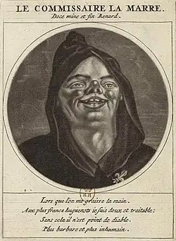 En raison de sa participation à la destruction du temple de Charenton après la révocation de l'édit de Nantes, Nicolas de La Mare est férocement caricaturé comme un moine ligueur encapuchonné et hilare, évocation du temps des Guerres de religion. La planche est ornée d'un sonnet moquant la corruption du commissaire[2].