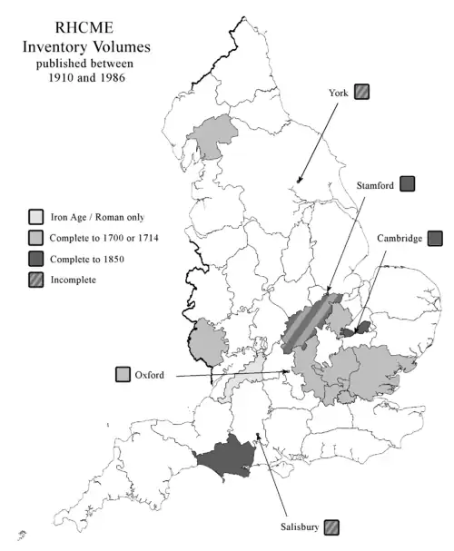 Plusieurs inventaires n'étaient pas terminés sur le plan géographique au moment de l'abandon du projet. Les villes et comtés couverts en partie sont York (abandonné après 1981) Cambridgeshire (abandonné après 1972), Northamptonshire (abandonné après 1986), Gloucestershire (abandonné après 1976) et Salisbury (abandonné après 1977). Dans certains cas, la recherche pour les prochains volumes a commencé après que la décision de ne pas procéder à la publication a été prise, et ceux-ci sont apparus dans des publications ultérieures de HMSO ou ailleurs. Dorset est le seul comté qui a été achevé dans son intégralité jusqu'à la date révisée de 1850, Cambridge et Stamford étant les seules agglomérations urbaines à l'avoir été jusqu'à la même date.