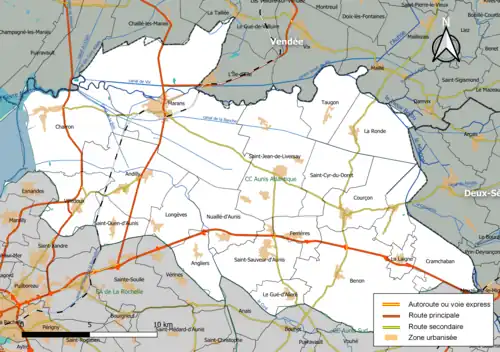 - ↑ « Le nouveau nom de la Communauté de communes », Sud Ouest, (lire en ligne, consulté le ) « Concernant le siège de cette nouvelle Communauté de communes, les avis divergent car la Communauté de communes de Courçon approuve la proposition du comité de pilotage qui le préconise à Saint-Sauveur-d’Aunis (Courçon), rejetée par la Communauté de communes marandaise qui l’établit plutôt à Marans, seul pôle structurant du territoire ».