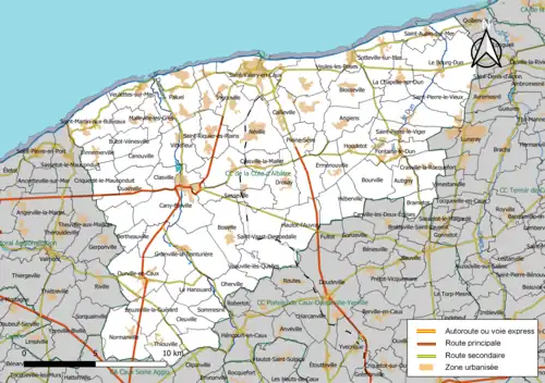 Située dans le nord du département de la Seine-Maritime, la communauté de communes de la Côte d'Albâtre regroupe 63 communes et s'étend sur 387,5 km2[12].