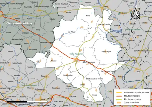 - ↑ Ce nombre était de 17 avant l'extension, le de la commune nouvelle de Rouillac à Gourville et la création de la commune nouvelle de Val-d'Auge.