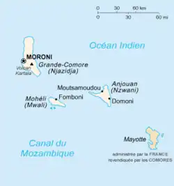 Les Comores, en forme longue l'union des Comores[7] (en comorien : Komori et Udzima wa Komori, en arabe : جُزُرُ ٱلْقَمَر (Juzur al Qamar) et الْاتِّحَادُ ٱلْقَمَرِيّ (al-Ittiḥād al-Qamariyy)), sont un État indépendant d'Afrique australe composé de trois îles[8] situées dans le Nord du canal du Mozambique, un espace maritime de l'océan Indien.