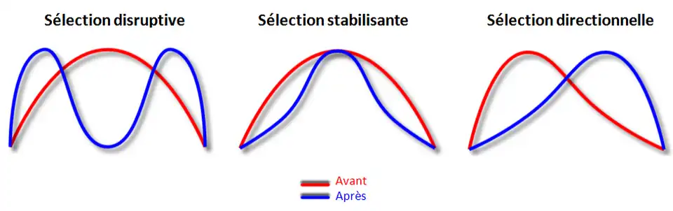 - La sélection disruptive qui sélectionne les phénotypes les plus extrêmes dans la population et peut ainsi amener à une spéciation, c'est-à-dire la formation de deux espèces différentes par éloignement génétiques de deux groupes d'individus au sein de la même populations.