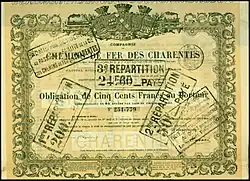 Le , un décret autorise la création de la Compagnie des chemins de fer des Charentes, société anonyme au capital de 25 millions de francs réparti en 50 000 actions. Les membres statutaires du premier conseil d'administration sont Messieurs : Numa Guilhou, Victor de Bertier, le général Bougenel, le comte de Bougy, Brian, Cavaré aîné, Émile Chevalier, le marquis Cusani, Guilhou père, Charles Jenty, Lainel, Lauxerrois, et Tavernier. Le siège est fixé à Paris[2].