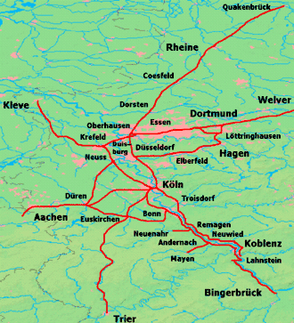 En outre, à partir de 1869, la Compagnie des chemins de fer rhénans construit la ligne de la droite du Rhin (de) depuis Ehrenbreitstein près de Coblence via Neuwied, Oberkassel jusqu'à Troisdorf, qui est atteinte en 1871. À Oberkassel, le ferry ferroviaire Bonn-Oberkassel (de) est ouvert le 1er novembre 1870 et reste en service jusqu'en 1914, reliant les tronçons gauche et droit du Rhin. Un passage similaire, la ligne Stolzenfels-Oberlahnstein (de), existe au sud de Coblence de 1862 à 1864 pour relier prématurément les tronçons droit et gauche du Rhin jusqu'à ce que la construction du pont de Pfaffendorf (de) puisse être achevée. La poursuite de la construction de la ligne Mülheim-Speldorf-Troisdorf (de) via Cologne-Mülheim, Opladen, Düsseldorf-Eller et Ratingen Ouest en 1874 relie cette ligne à la ligne de la Ruhr susmentionnée et ouvre une route bon marché vers le sud pour le transport du charbon[17].