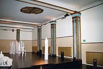 La salle de cinéma et la salle de bal sont superposées et communiquent par l'intérieur[3].