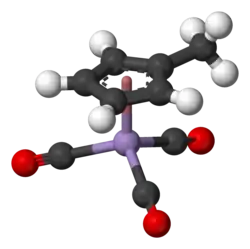 Les complexes métalliques formés d'un seul ligand organique plan lié de face au lieu de deux constituent une autre sous-famille de composés, les composés demi-sandwich dont l'exemple le plus connu est sans doute le (méthylcyclopentadiényl)manganèse tricarbonyle (MMT). De tels composés sont également dits « en tabouret de piano », les ligands opposés au ligand organique formant un « pied », attaché à « l'assise » de l'hydrocarbure cyclique (benzène ou cyclopentadiène)[11],[12].
