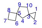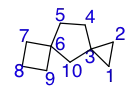 Par exemple, le composé A est appelé 1-bromo-3-chloro-spiro[4.5]décan-7-ol et le composé B 1-bromo-3-chloro-spiro[3.6]décan-7-ol. La molécule spiro composée d'un cycle cyclohexane et d'un autre cyclopentane est appelée spiro[4.5]décane. Cette nomenclature a été proposée par Adolf von Baeyer[1] en 1900 et adoptée par l'IUPAC[2]. Pour la numérotation des atomes de tels composés, voir la section suivante.