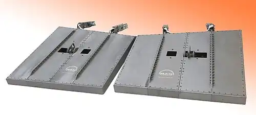 - Volets mobiles de réglage de poussée pour réacteurs d'avions de chasse[24], permettant d'adapter le diamètre du flux des gaz à la puissance développée.