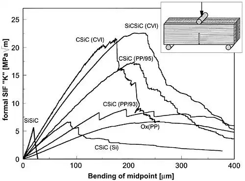 Les courbes de résistance à la rupture des divers composites présentés sur la figure montre que la dépense spécifique d'énergie nécessaire à la rupture complète d’un composite est très largement supérieure à celle nécessaire pour une céramique SiSiC non composite. Le maximum des diverses courbes de résistance indique la force nécessaire pour briser l'éprouvette. Les divers types et leurs procédés de fabrication présentent des différences évidentes et importantes entre les qualités de cette classe de matériaux, en particulier en ce qui concerne la résistance à la rupture.