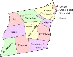 Le comté d'Albany est constitué de 19 communes dont 3 villes (cities), 10 towns, 6 villages ainsi que 6 census-designated places.