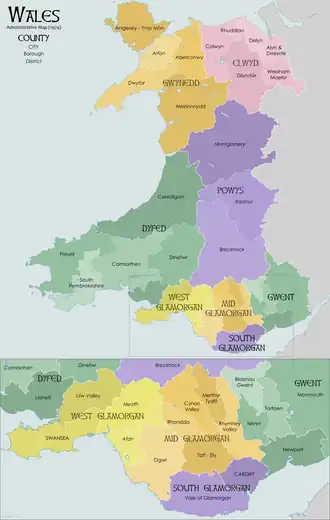 Finalement, le Local Government Act 1972 institue au pays de Galles de nouvelles zones de gouvernement local (local government areas en anglais) appelées « comtés » au niveau supérieur, eux-mêmes divisés en « districts » au niveau inférieur. Pour ce faire, l’ensemble des territoires des comtés administratifs, abrogés au , sont répartis en huit nouveaux comtés : la Clwyd, le Dyfed, le Gwent, le Gwynedd, le Mid Glamorgan, le Powys, le South Glamorgan et le West Glamorgan[γ].