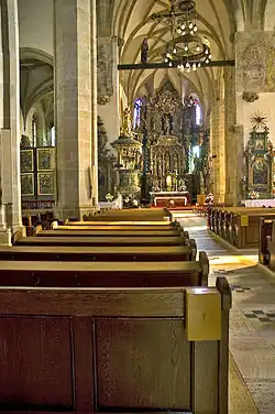 L’édifice est de style gothique. Sa longueur fait 54,7 m, sa largeur 34,45 m. La hauteur intérieure de la nef est de 16 m. La pointe du clocher atteint la hauteur de 71 m.