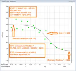 La CI50 d'un médicament peut être déterminée en construisant une courbe de réponse et en examinant l'effet de différentes concentrations d'un antagoniste sur l'inversion de l'activité d'un agoniste. Les valeurs de la CI50 peuvent être calculées pour un antagoniste donné en déterminant la concentration nécessaire pour inhiber la moitié de l'effet biologique maximal de l'agoniste considéré[2].