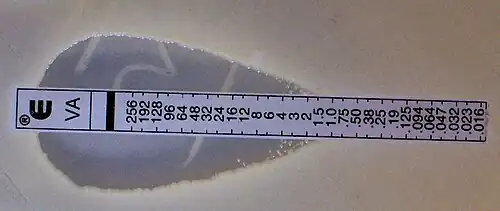 Les tests epsilon (Etests) peuvent également être utilisés comme méthode alternative pour déterminer les valeurs de CMI d'une large gamme d'agents antimicrobiens contre différents groupes d'organismes, qui a été largement utilisée dans les laboratoires de microbiologie du monde entier. Fabriquées par bioMérieux, les Etests sont des bandelettes réactives en plastique non poreuses prêtes à l'emploi avec un gradient d'antibiotique prédéfini, couvrant une plage de concentration continue[18].
