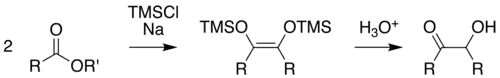 Cette méthode, décrite par K. Rühlmann[5], utilisé du chlorure de triméthylsilyle comme piège chimique, permettant de réduire l'efficacité des réactions en compétition. Cette méthode permet d'accroitre considérablement le rendement. Le clivage hydrolytique du silyléther donne l'acyloïne. Pour permettre un clivage doux, on peut utiliser dans certains cas du méthanol.