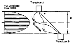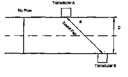En raison de l'âge relatif de la technologie, il peut être bénéfique de discuter du fonctionnement du compteur à ultrasons à chemins multiples pour illustrer les effets de la distorsion du profil d'écoulement et des tourbillons. Il existe différents types de mesures de débit utilisant des sons haute fréquence. Les dispositifs de mesure de transfert de propriété disponibles aujourd'hui utilisent le concept du temps de trajet. La différence de temps de vol avec le flux est comparée au temps de vol contre le flux. Cette différence est utilisée pour inférer la vitesse moyenne d'écoulement sur le chemin du son[14]. Fig.(5) montrant le chemin du son du compteur à ultrasons - sans écoulement qui illustre ce concept.