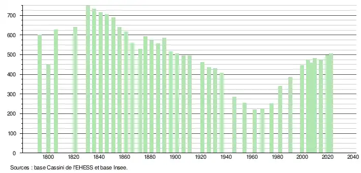 L'évolution du nombre d'habitants est connue à travers les recensements de la population effectués dans la commune depuis 1793. Pour les communes de moins de 10 000 habitants, une enquête de recensement portant sur toute la population est réalisée tous les cinq ans, les populations de référence des années intermédiaires étant quant à elles estimées par interpolation ou extrapolation[23]. Pour la commune, le premier recensement exhaustif entrant dans le cadre du nouveau dispositif a été réalisé en 2004[24].