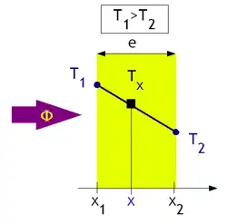 Notons T1 la température du plan situé à l'abscisse x1, et T2 la température du plan situé à l'abscisse x2. Notons e = x2 – x1 l'épaisseur du mur. En régime stationnaire, T est une fonction affine de x, d'où :